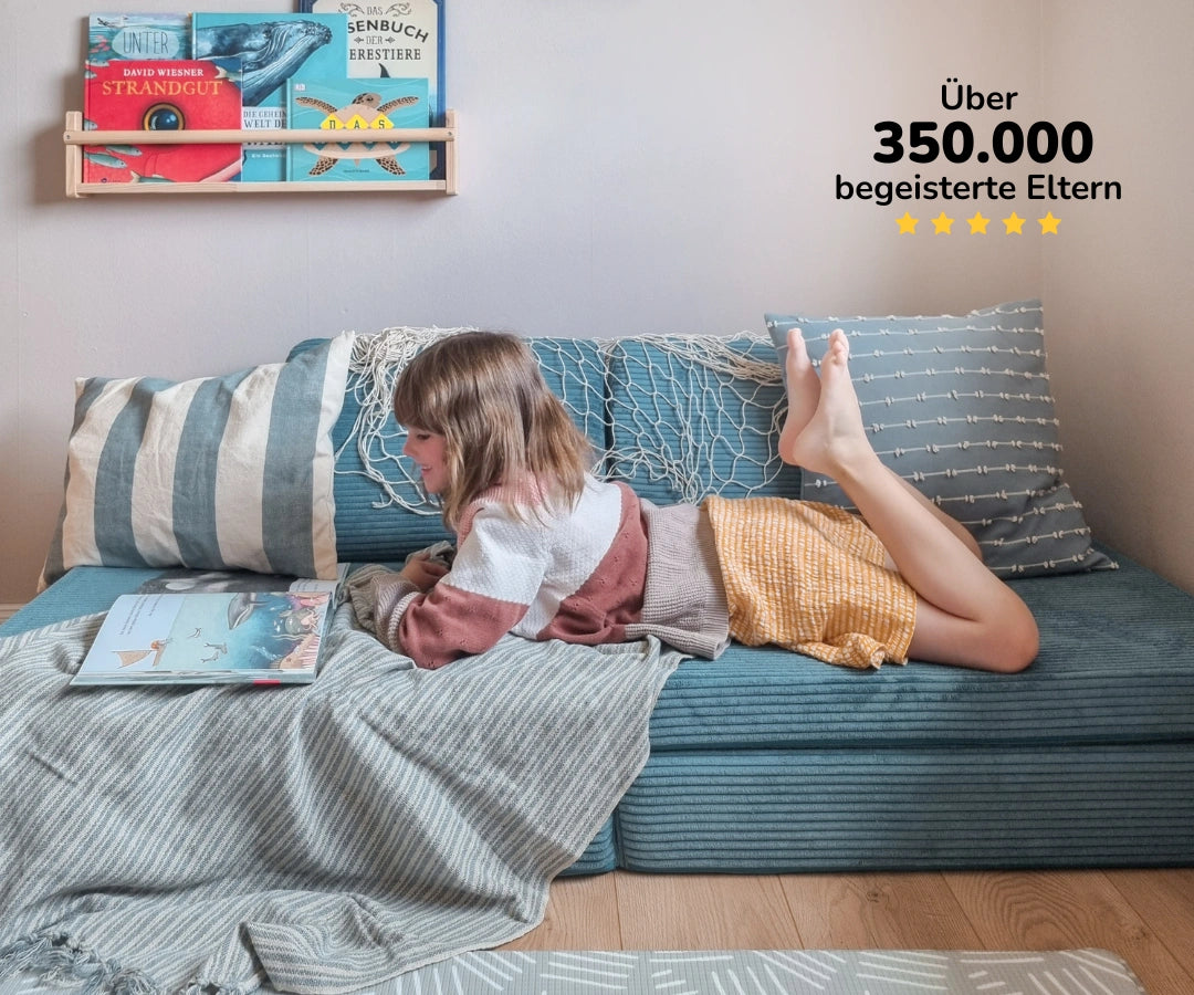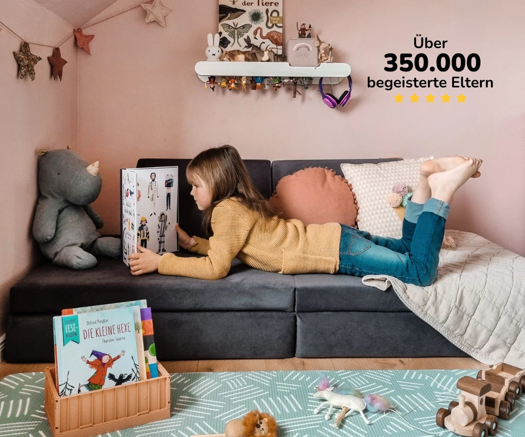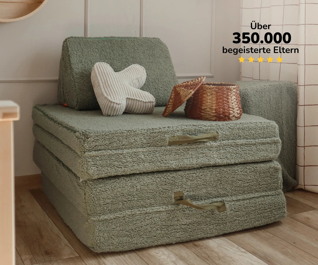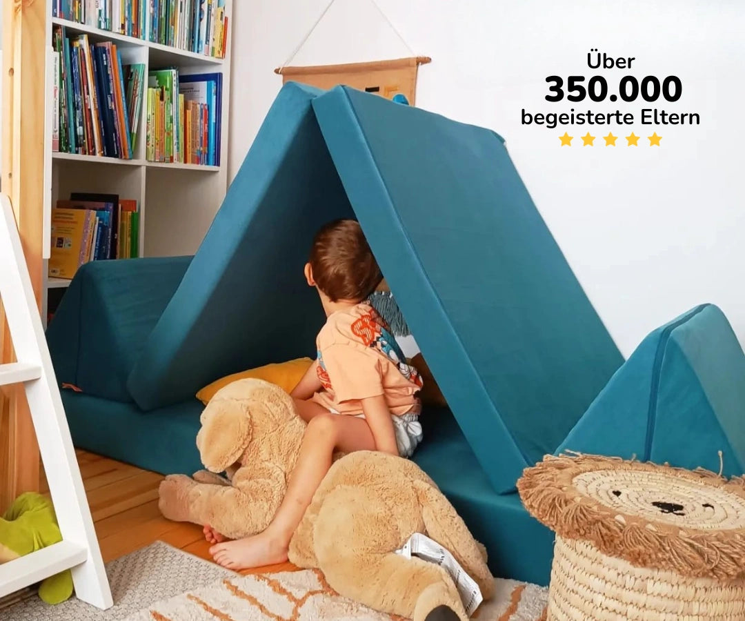 🧡 Das Schöne daran: Aufgrund ihrer variablen Nutzbarkeit und Modularität, (wie z.B. als Sofa, Gästebett, Leseinsel, Kletterspielzeug, Höhle), braucht man keine großen Räume. Oft reicht eine bewusst gestaltete Zone, die beliebig mit weiterem Zubehör oder weiteren Kinderspielmöbeln erweitert werden kann, wenn mehr Platz dafür gegeben ist (wie z.B. mit dem Spieltisch, Hüpfpolster, Sitzsäcke, Donut, Kletterbogen von Funzy etc.).