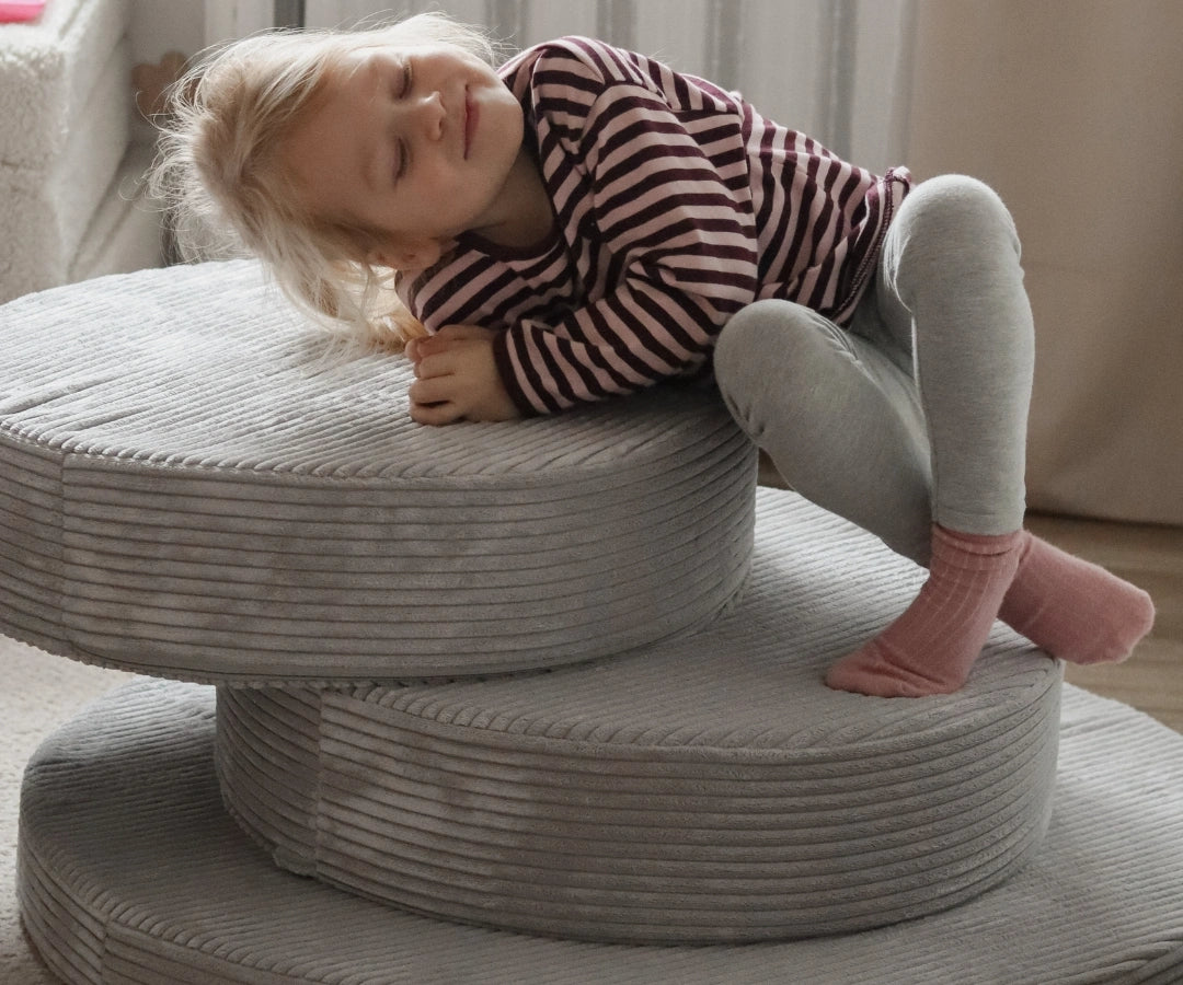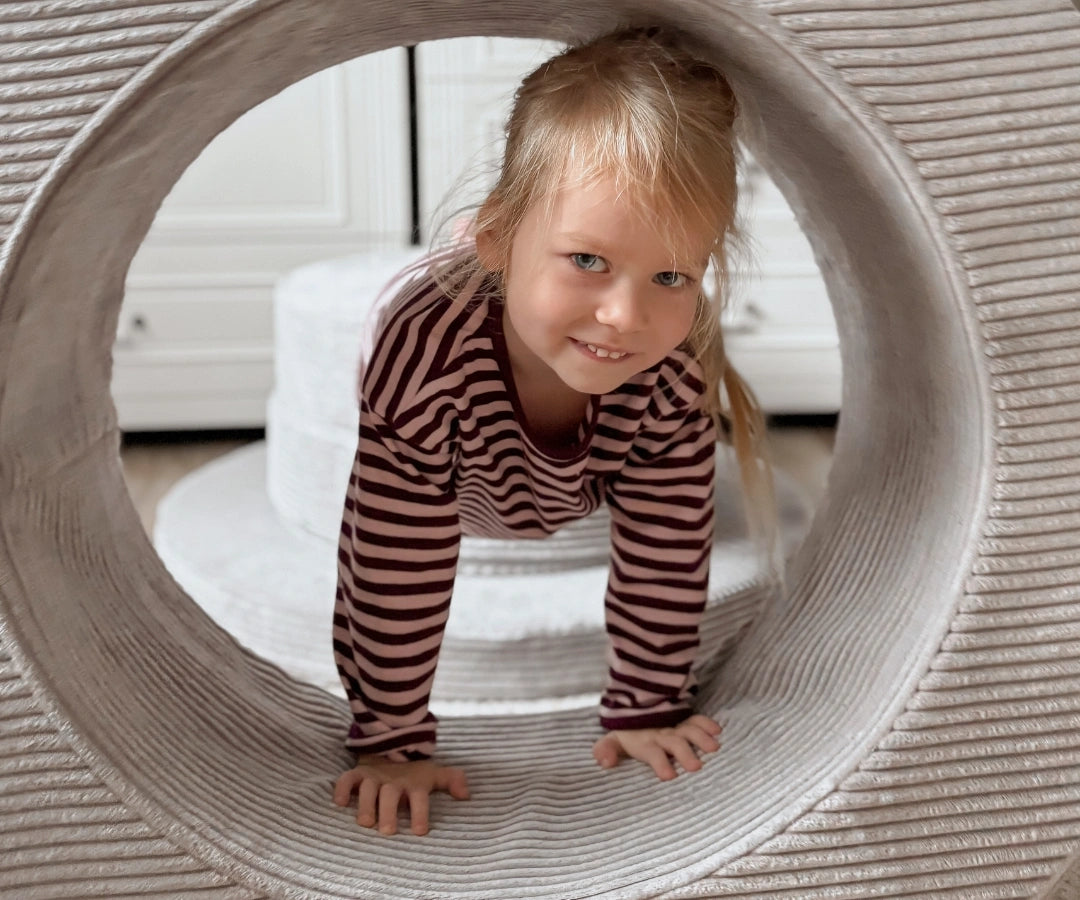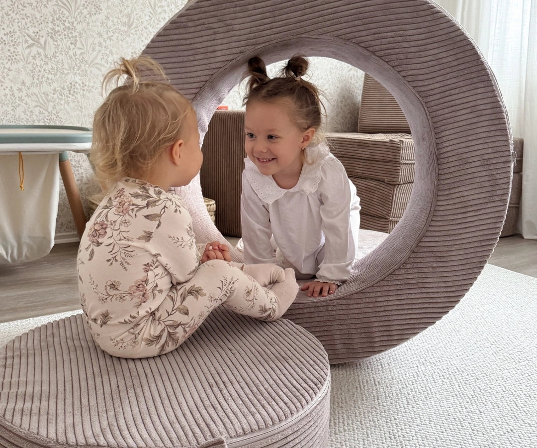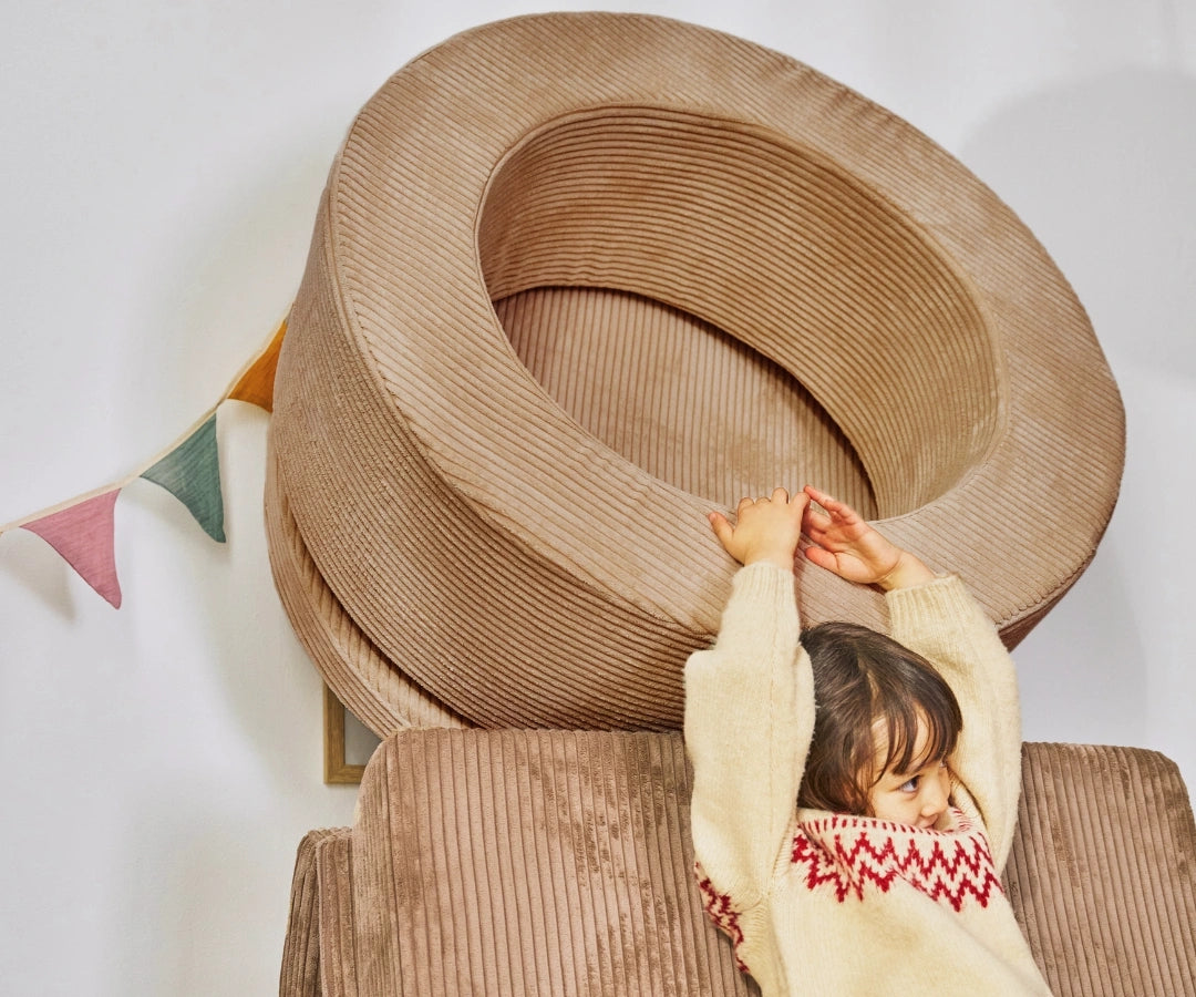 Ja und genau dafür ist er perfekt. Der Donut ergänzt das Spielsofa als Mittelpunkt eurer Spielwelten: als Insel/Berg für einen Parcours & “Der Boden ist Lava“, als Tunnel/Portal zwischen Modulen, als Podest/Bühne für Rollenspiele oder als ruhiger Rückzugsring zum Lesen und Kuscheln. Danach lassen sich die Teile einfach ineinander stapeln und der Donut wirkt als Ottoman/Couchtisch wieder wohnzimmertauglich.