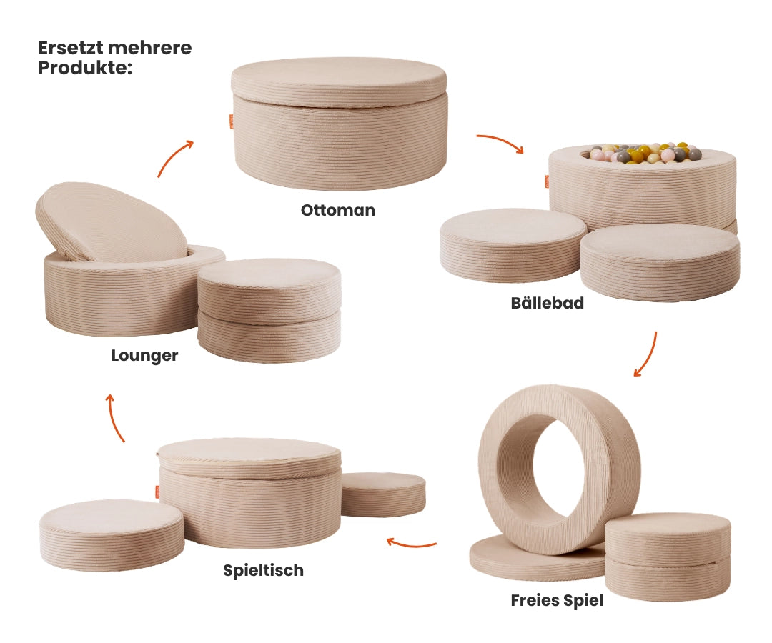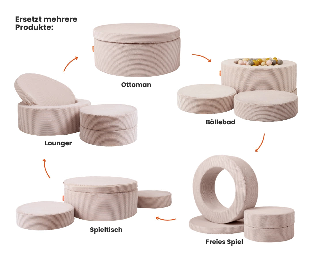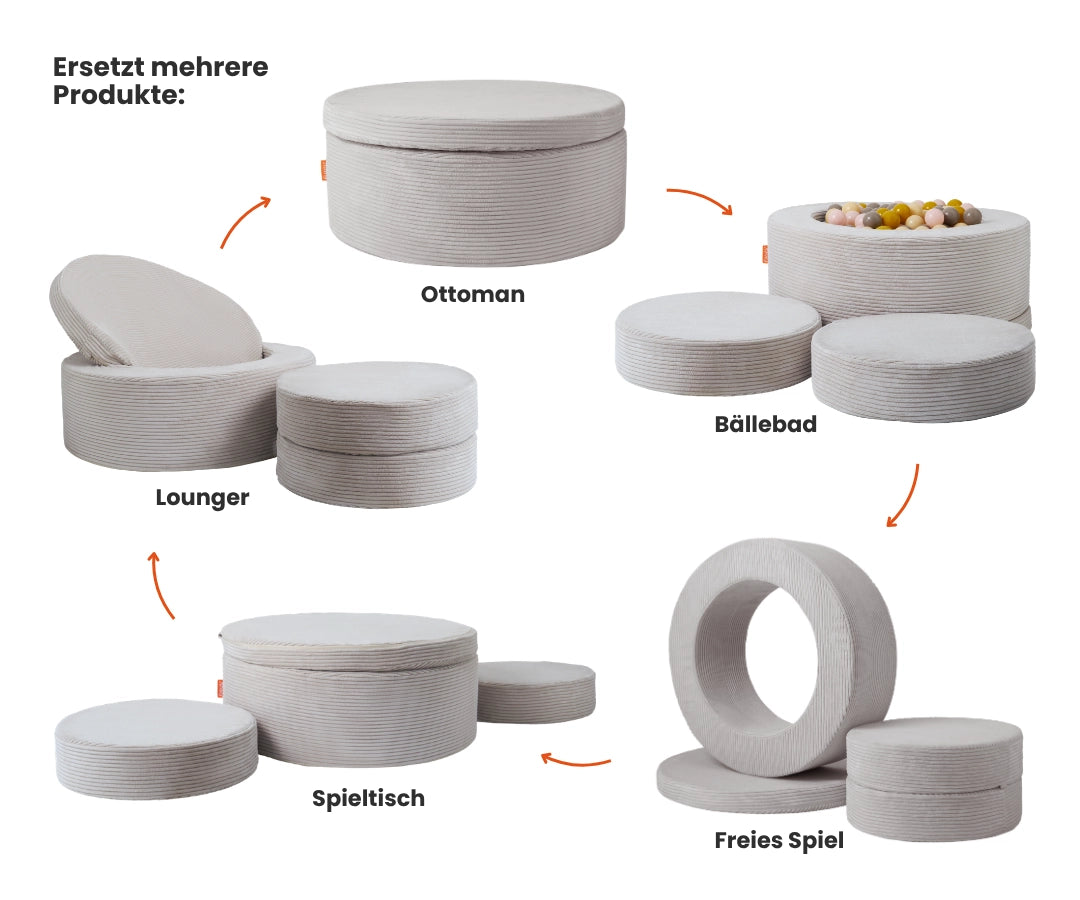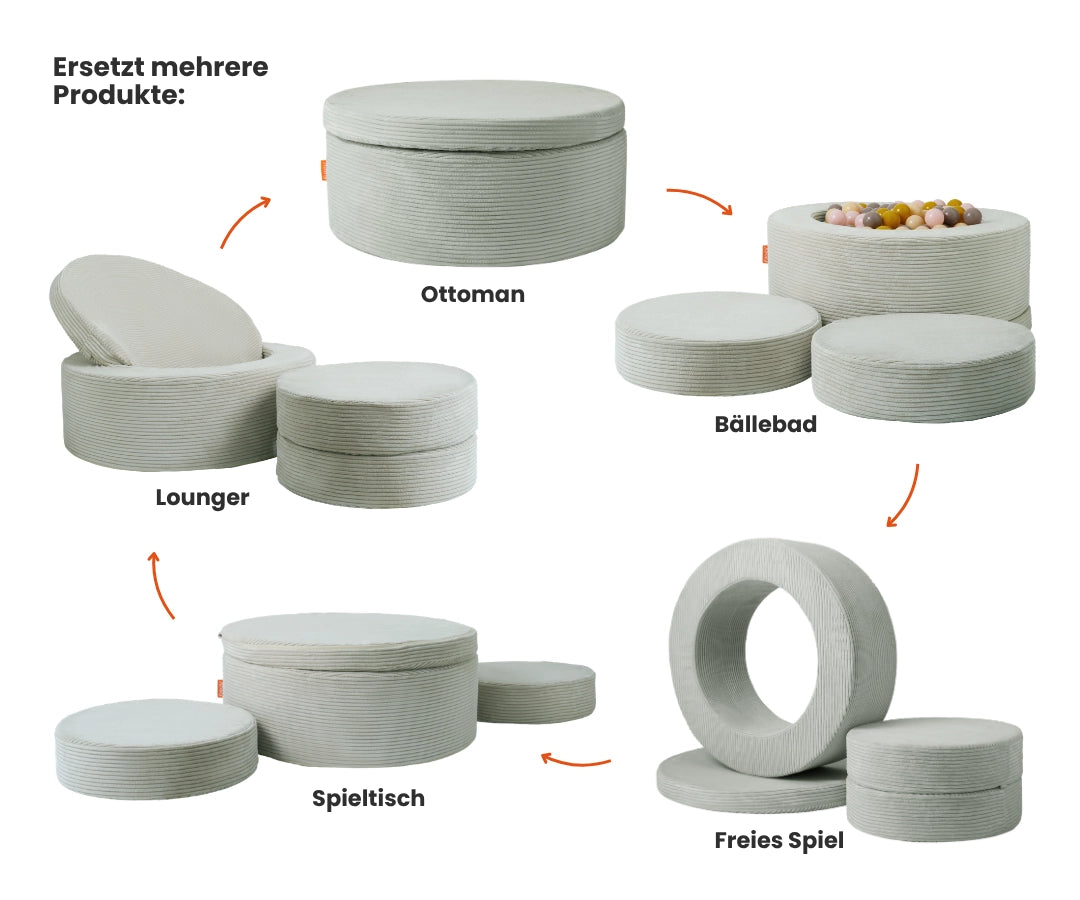 Bällebad, Balancierring, Hüpfzone, Höhle, Podest, Tisch, Chill-Lounger oder Add-on für das Spielsofa. Der Donut ersetzt viele einzelne Spielsachen und fühlt sich trotzdem nie gleich an.