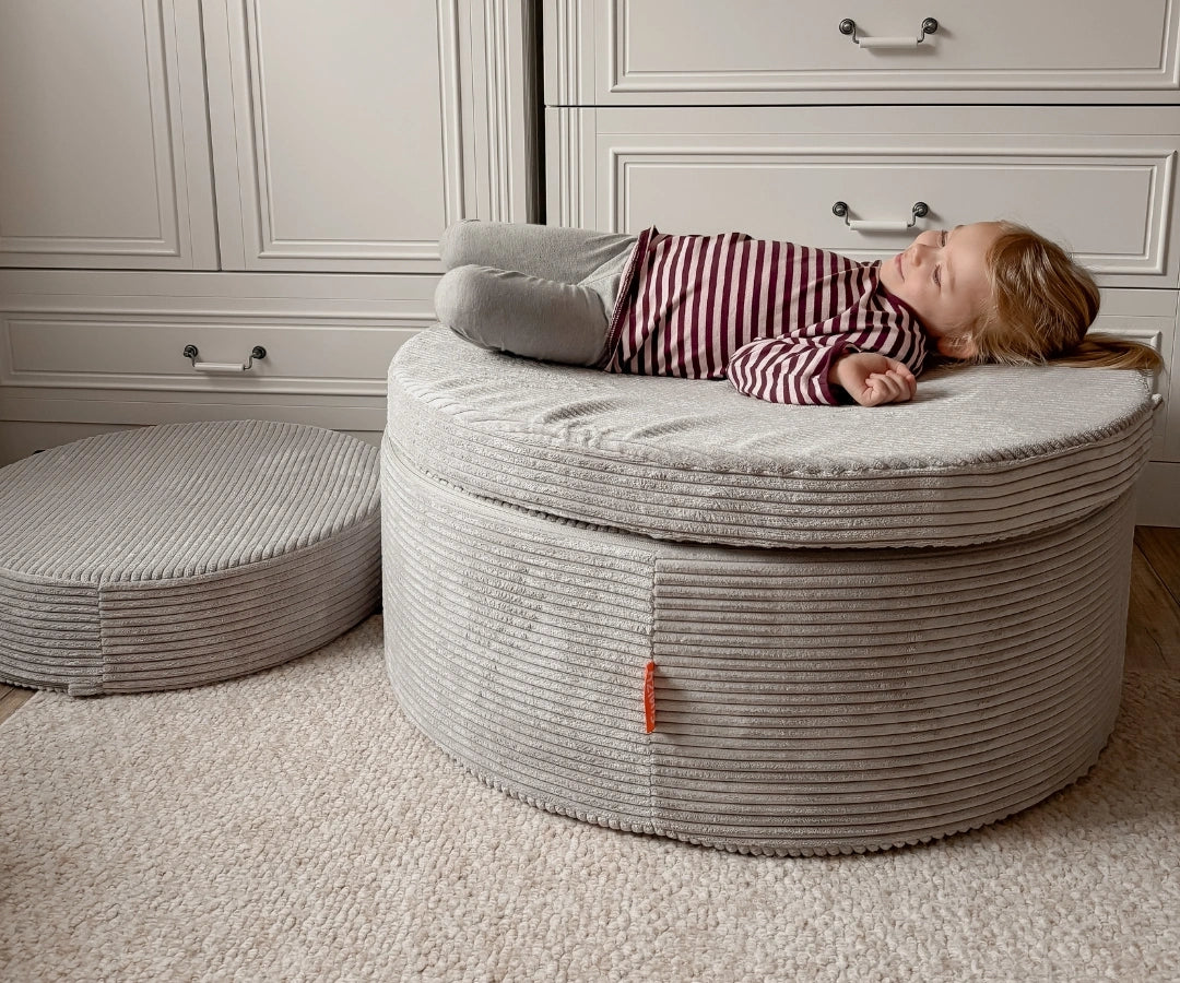 Sind die Kinder fertig, werden die Teile einfach ineinander gestellt. Der Donut wird zum kompakten Ottoman oder Couchtisch. Tablett, Bücher oder Deko drauf, fertig. So bleibt euer Wohnzimmer aufgeräumt, und der Spielring sieht aus wie ein Design-Möbel, nicht wie ein sperriges Spielgerät.