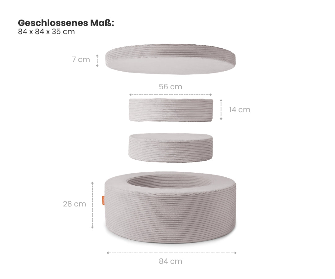 Der Donut hat in der Grundform einen Außendurchmesser von ca. 84 cm und eine Höhe von ca. 35 cm. Damit ist er groß genug zum Reinsitzen, Reinspringen und Balancieren, bleibt aber kompakt genug für Wohnzimmer und Kinderzimmer.