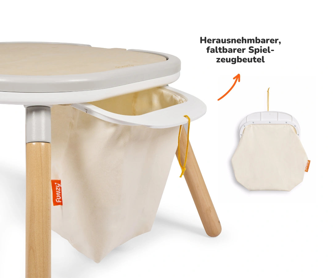 The bag is simply pushed into the center of the table and can be removed just as easily. You can pull it open, drop toys in, and close it – done. No more fumbling around putting things away, no more searching for building blocks. Ideal for a quick cleanup in the evening.