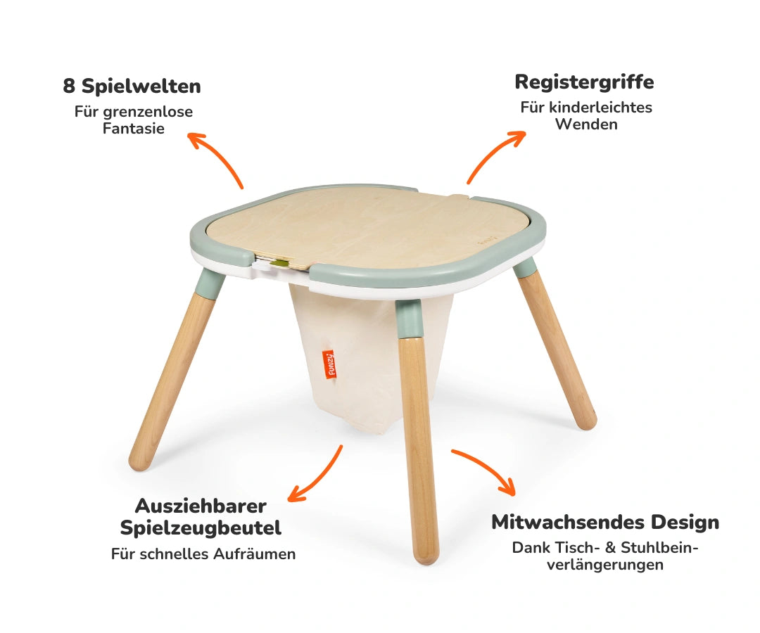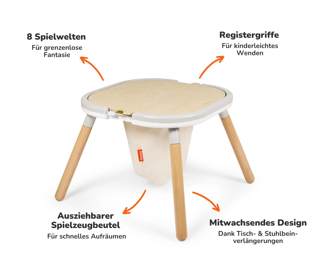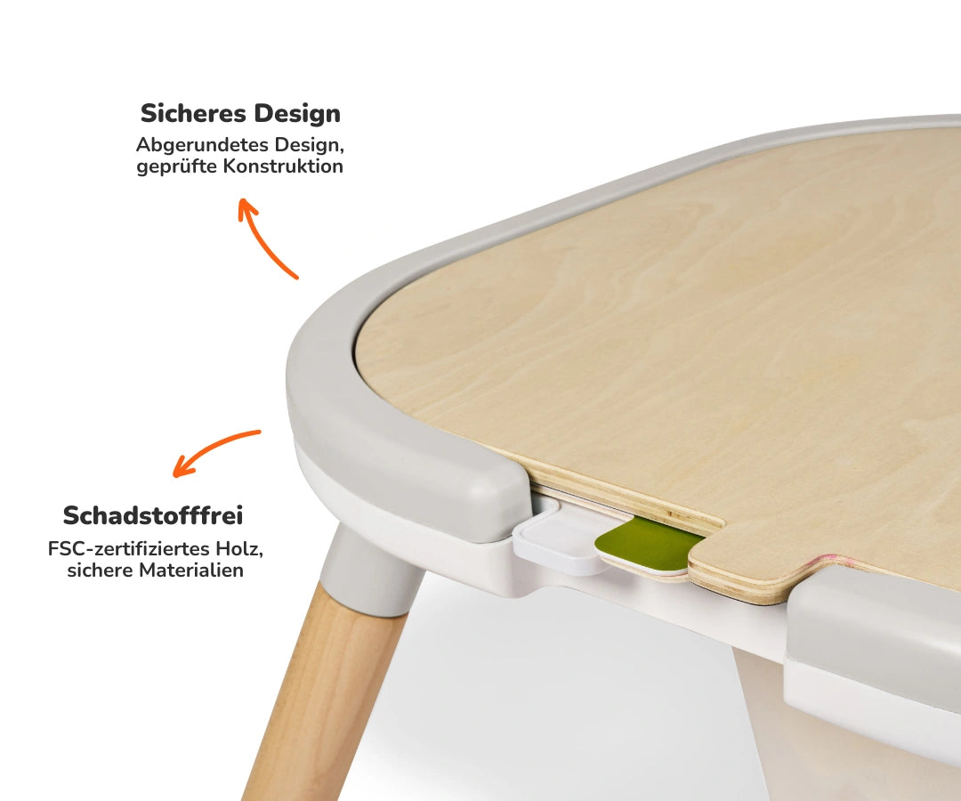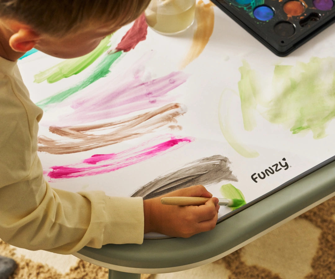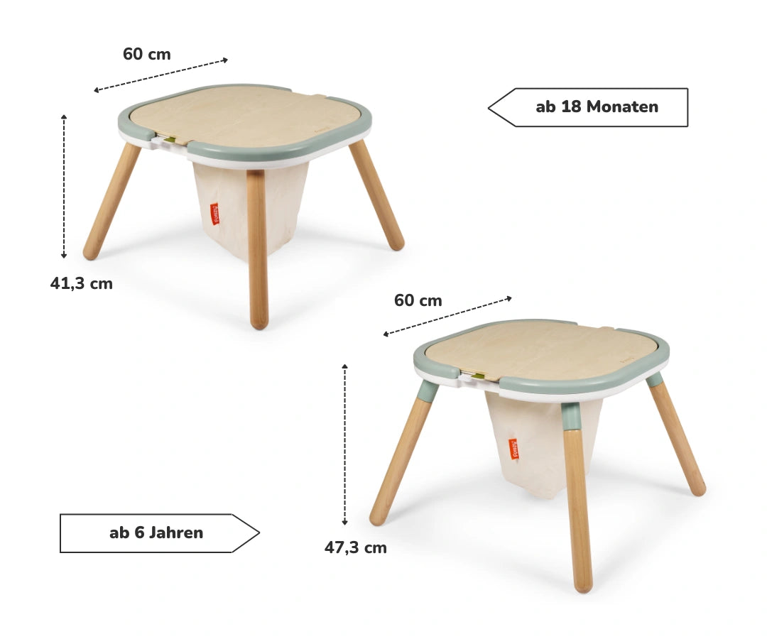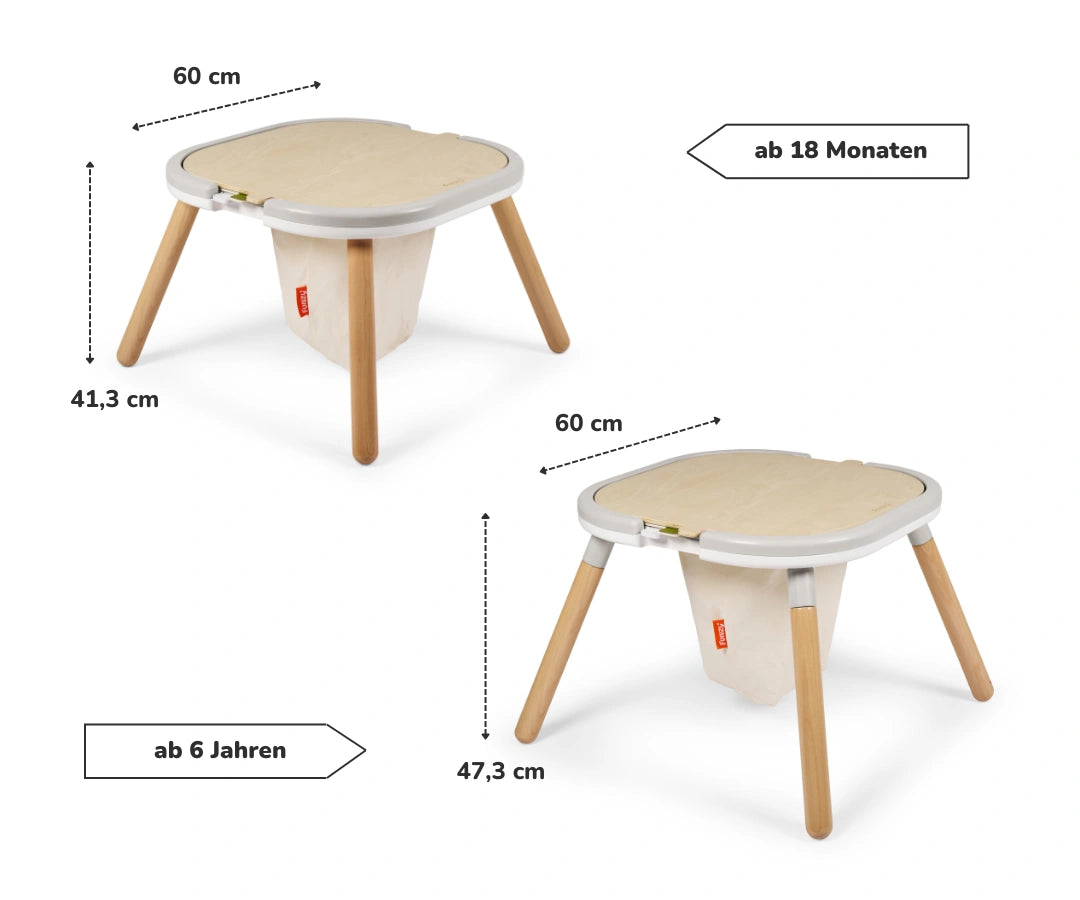 The Funzy play table is ideal for children from approximately 1.5 years old – that is, as soon as your child can sit independently and shows interest in their first creative activities. Thanks to its grow-with-me design, it adapts to children up to approximately age 8.