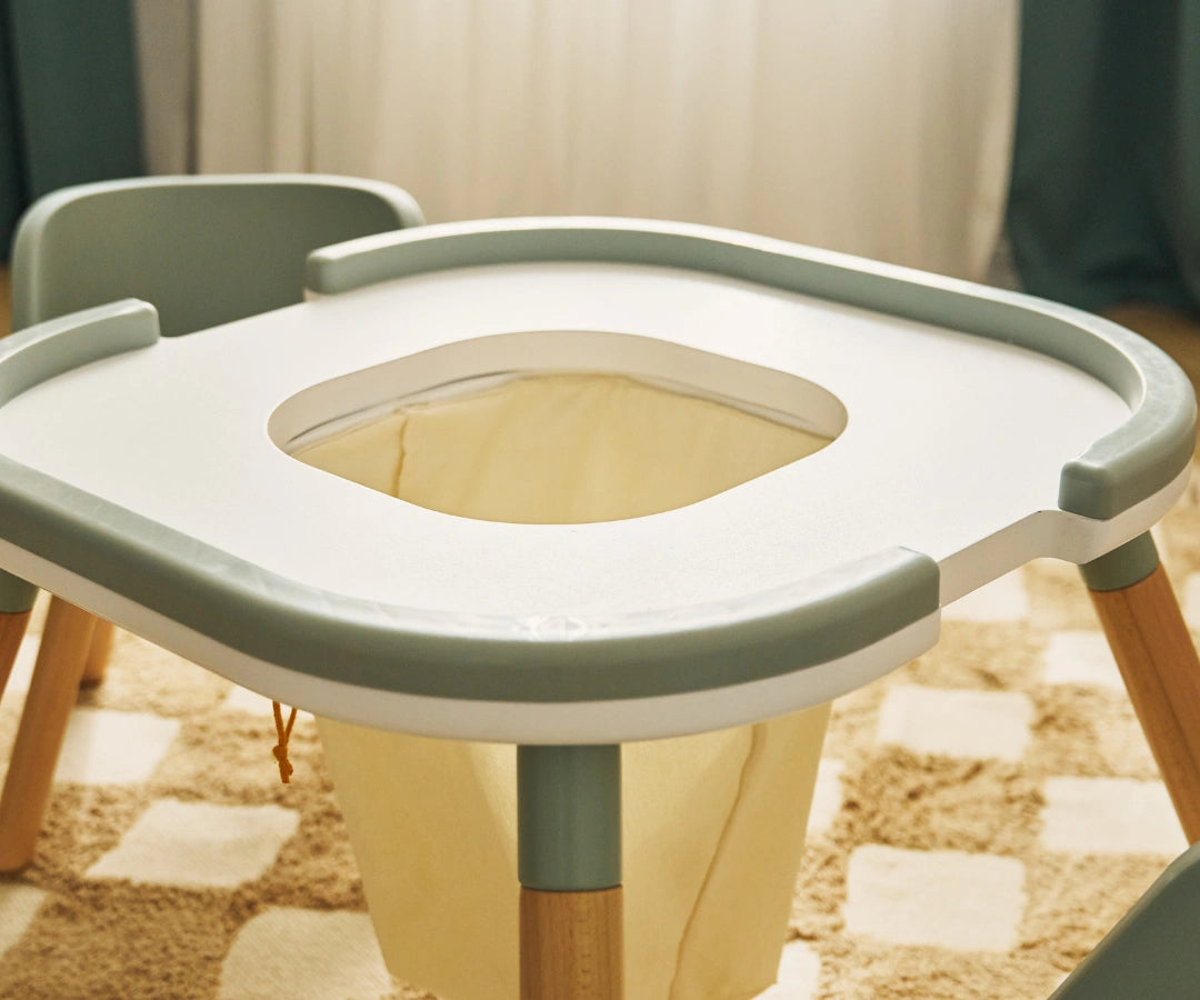 Hidden in the center of the table is a clever storage bag with a drawstring closure. Just pop in the toys, tie the drawstring, and the nursery is tidy. Keeping things organized has never been easier.