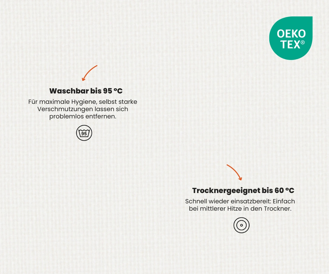 • Waschbar bis 95 °C, trocknergeeignet bis 60 °C – für maximale Hygiene, schnell wieder einsatzbereit